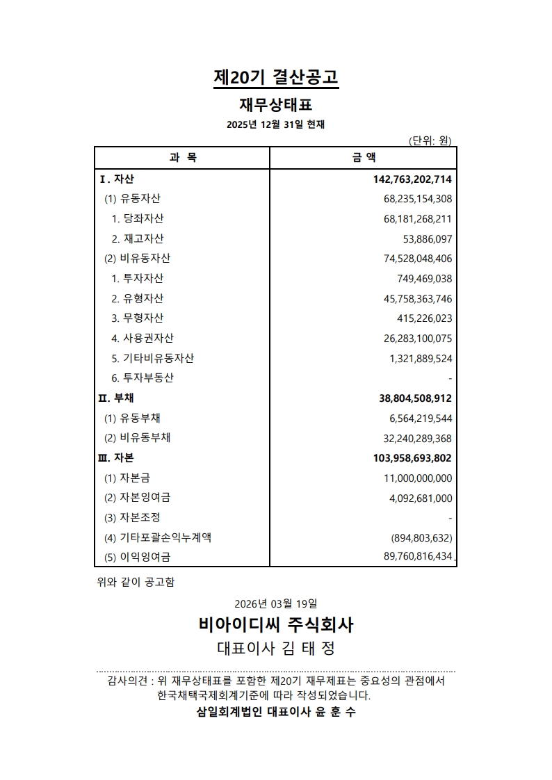 | 6 | 비아이디씨 주식회사 외부감사인 선임 공고 | 관리자 | 2021-03-26 | 814 | |